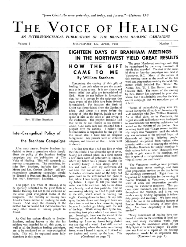 Let me make the final statement: In comparison with you, beloved evangelists and all the rest of the preachers and with William Branham, let me humbly, but truthfully make this statement: he was a promised prophet like John the Baptist was a promised prophet. God made history. God began through William Branham in 1946 this mighty healing and restoration revival. In the first few years he was the only one, then only from 1948–49–50 the rest and many others in the 50s were inspired.